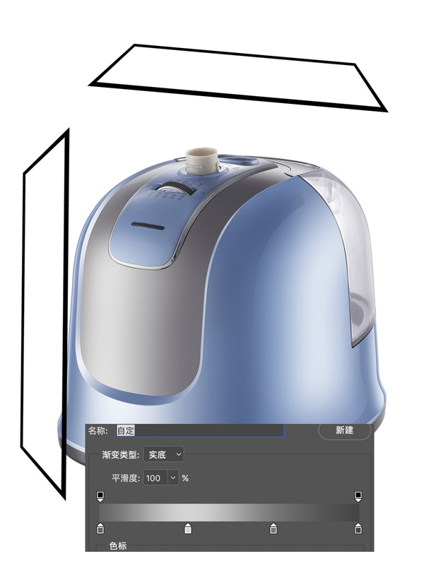 産(chǎn)品的上端是弧形的頂部,所以光線(xiàn)會順着結構向後延伸。我們用(yòng)畫筆(bǐ)工(gōng)具(jù),吸取産(chǎn)品上的顔色,用(yòng)柔邊畫筆(bǐ)把漸變塗抹均勻,可(kě)以通過高斯模糊等方式使明暗過度更自然,以表現産(chǎn)品表面光滑的效果。