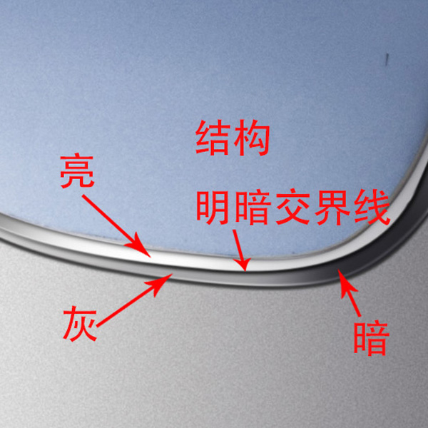 繼續處理(lǐ)到金屬部分(fēn),這條金屬邊有(yǒu)兩個面,所以中(zhōng)間會有(yǒu)一條轉折的結構線(xiàn),根據燈光效果處理(lǐ)好亮面、灰面、暗面和結構線(xiàn)。金屬材質(zhì)對比度相對較強。