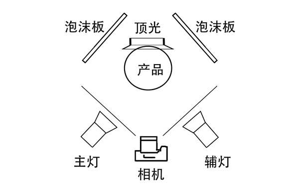 我們先看看占地面積最大的藍色區(qū)域,結合拍攝時的布光示意圖,不難看出這是一套對稱的布光手法,左右兩個對稱位置的燈加上頂燈,後方兩塊泡沫闆反光勾出産(chǎn)品的輪廓線(xiàn)。所以藍色區(qū)域的明暗關系如下圖所示。