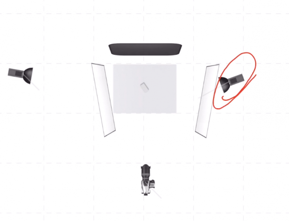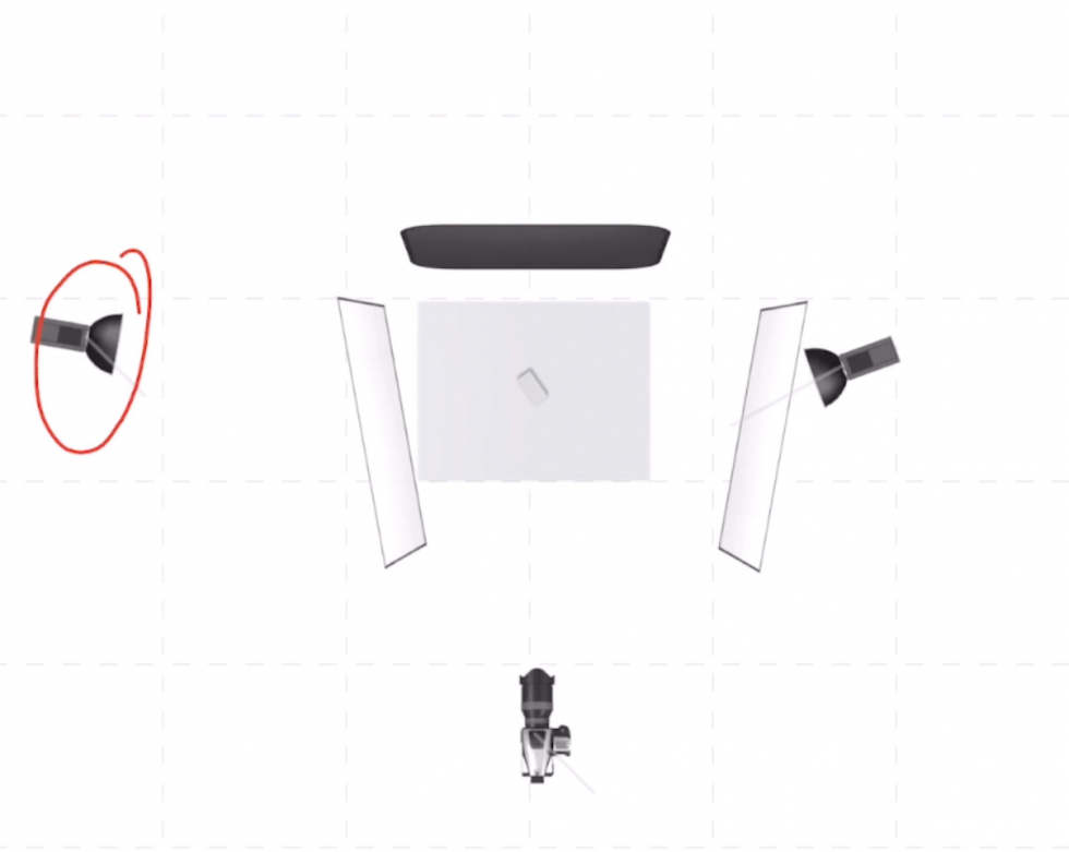 我們把主光放在眼鏡的十點方向,距離稍微遠(yuǎn)一點兒位置,高一點兒這樣做是為(wèi)了讓硫酸紙的過渡變得更大更柔,并且我們不把主光放在正側面,所以同時可(kě)以兼顧到一些鏡框的邊緣的一些小(xiǎo)小(xiǎo)的高光。