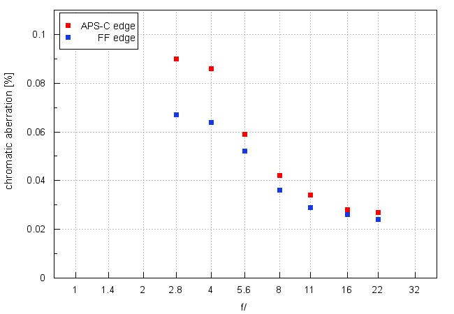 随着光圈的收縮,色差顯著減少。隻有(yǒu)在接近最大光圈,色差值才達到輕量到中(zhōng)等這樣,這點色差沒什麽可(kě)抱怨的。當您使用(yòng)微距鏡頭正常的工(gōng)作(zuò)光圈時,色差達到非常低的水平。