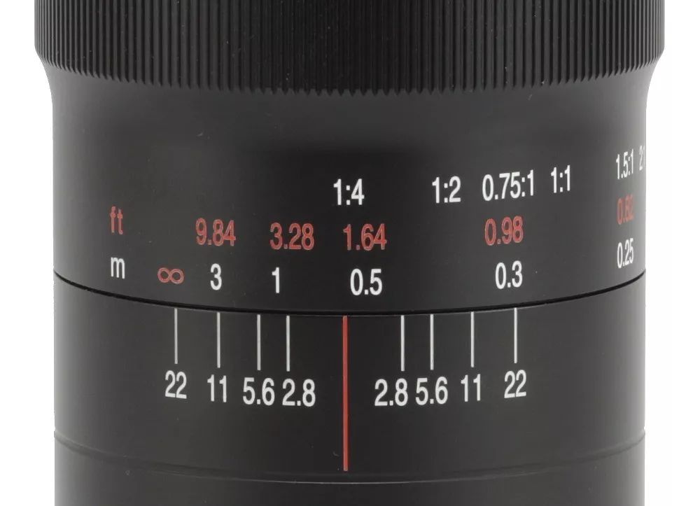 鏡筒的前端是一個長(cháng)且黑的金屬環,尾部是景深刻度标識,顯示了F22, F11, F5.6F2.8處的景深。不過說實話,我不确信這個刻度标識是否準确,在接下來的章節中(zhōng)我們會詳細讨論這一點。