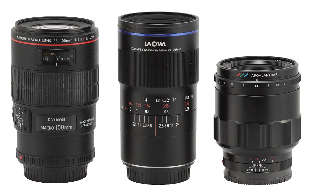 下圖中(zhōng)間是老蛙鏡頭,另外兩隻是佳能(néng)EF 100mmF2.8 8L IS USM微距鏡頭和福倫達APO-Lanthar 65mmF2 Aspherical 1:2微距鏡頭。
