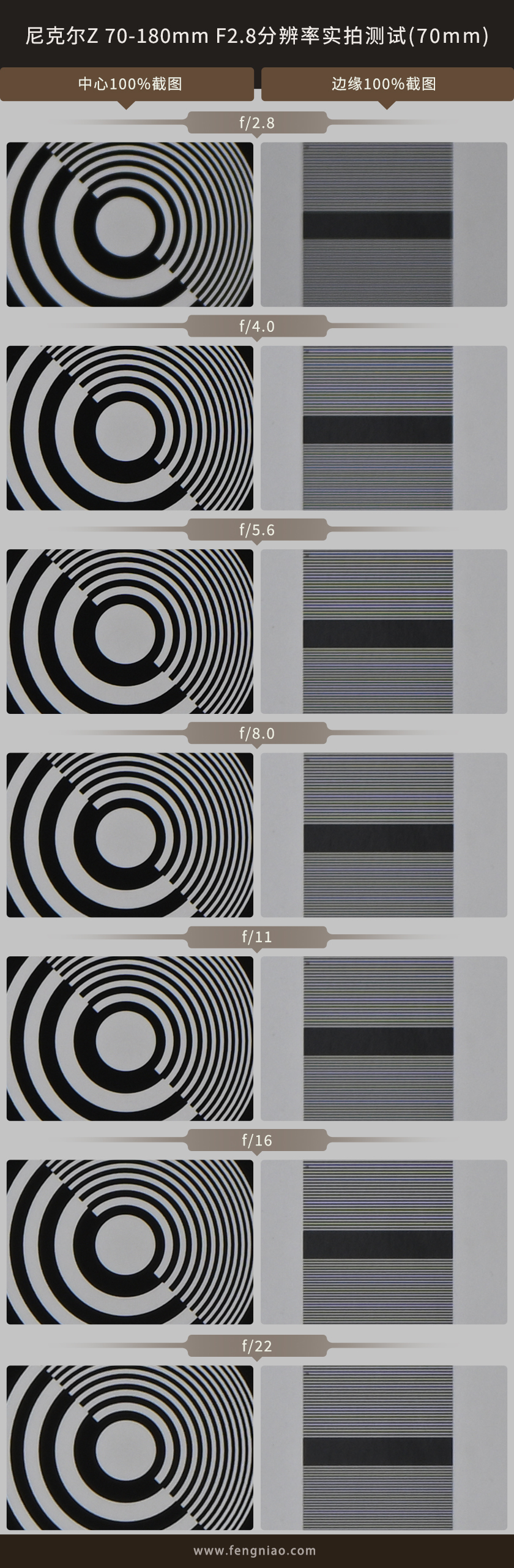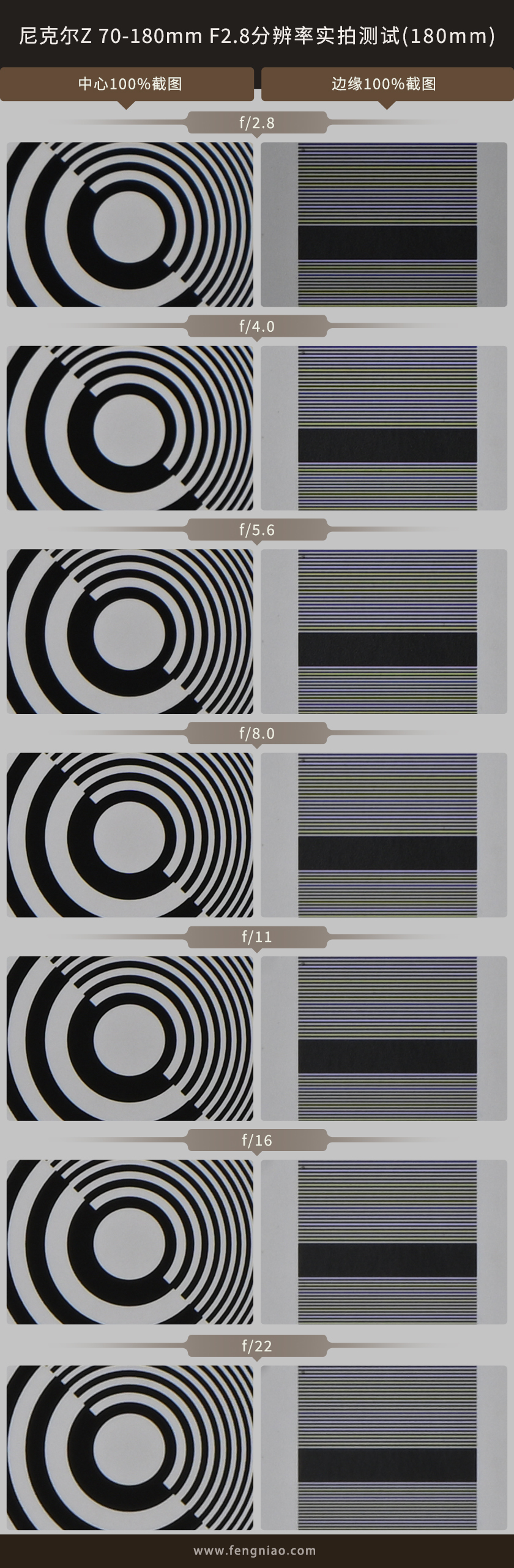 可(kě)以看到180mm端的測試結果基本上與70mm端的測試結果基本相同,在光圈全開的情況下畫質(zhì)略微松散,在光圈為(wèi)F4.0-F16的情況下中(zhōng)心與邊緣畫質(zhì)有(yǒu)着不錯的表現。直到最小(xiǎo)光圈F22時中(zhōng)心與邊緣畫質(zhì)才有(yǒu)所下滑。